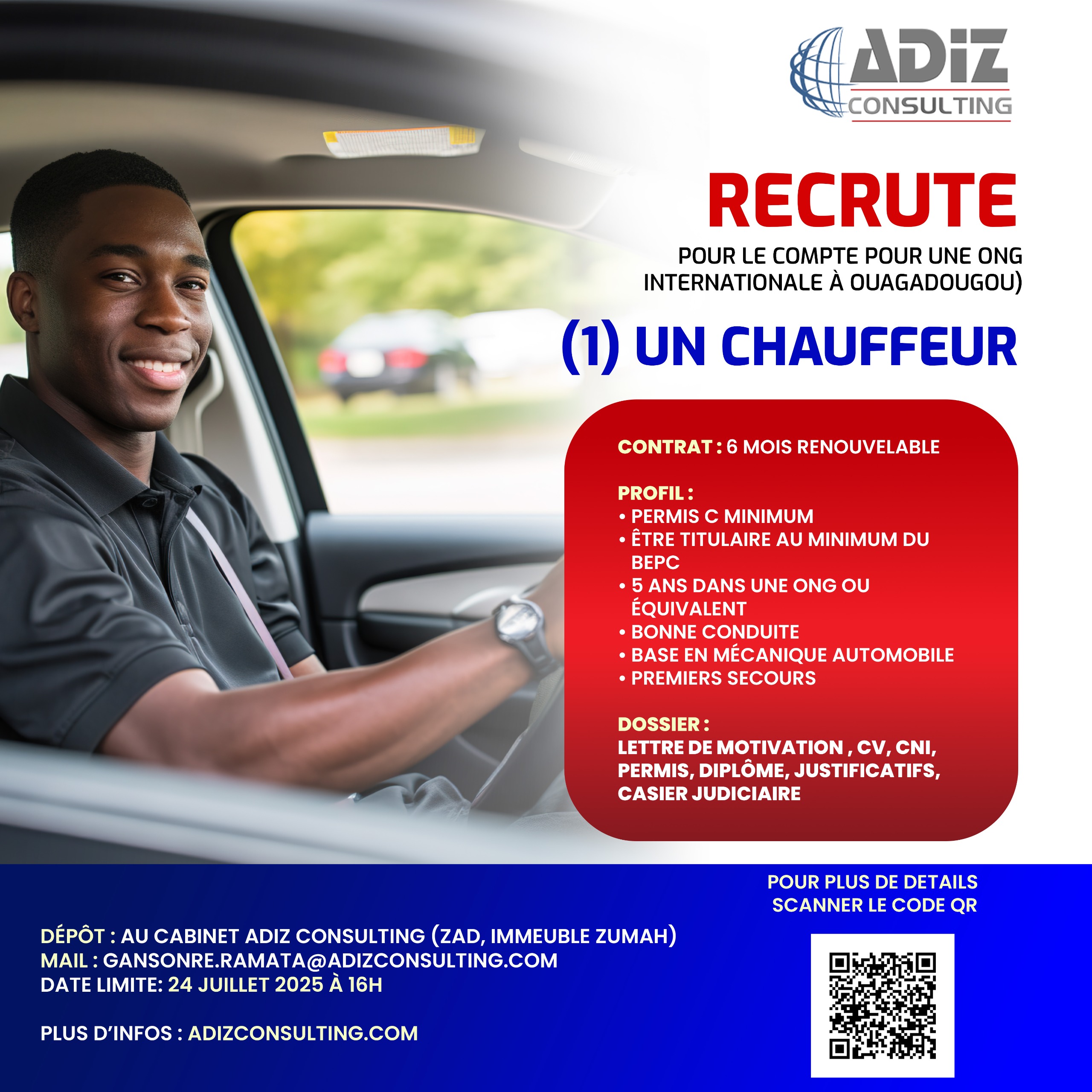 Le Cabinet ADIZ Consulting recrute un chauffeur pour le compte d’une organisation non gouvernementale (ONG) Internationale basée à Ouagadougou admin Actualités juillet 23, 2025juillet 23, 2025 0 commentaire 📥 Télécharger le document PDF